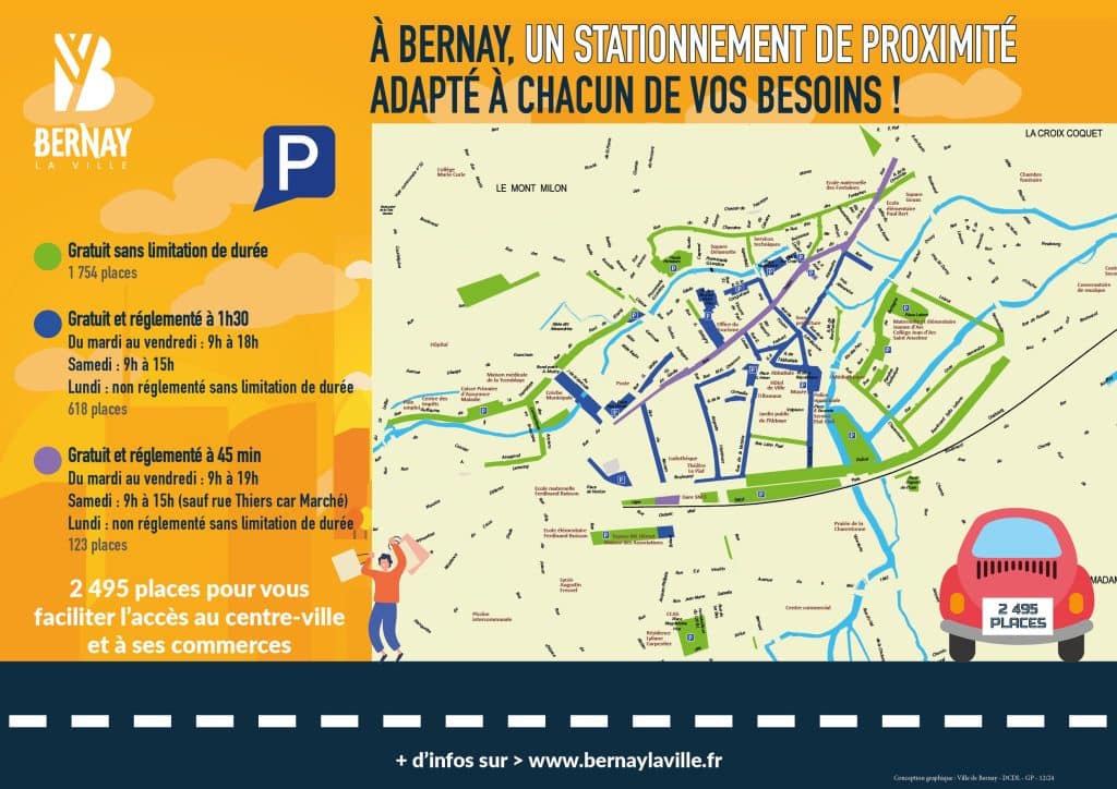 À Bernay, le stationnement est gratuit, mais il est soumis à une réglementation en zone bleue afin de garantir une bonne rotation des véhicules, notamment dans le centre-ville. L’objectif : faciliter l’accès aux commerces et aux services pour tous.